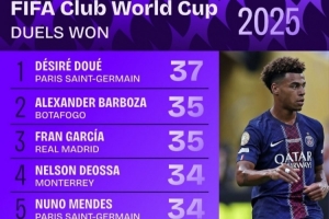 世俱杯成功对抗榜:杜埃37次居首,弗兰-加西亚35次、门德斯34次